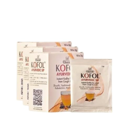 - QUICK RELIEF FROM COUGH, COLD & SORE THROAT: Kofol Ayurvedic Sip is a sugar-free kadha for cough and cold crafted to soothe sore throat, ease throat infections, and reduce inflammation in the respiratory tract. Its quick action clears excess mucus, while its natural warmth makes it highly effective against recurrent cold and cough due to pollution, seasonal change, or allergies. A safe, non-drowsy ayurvedic hot sip, it helps the whole family fight flu infections and recover faster.